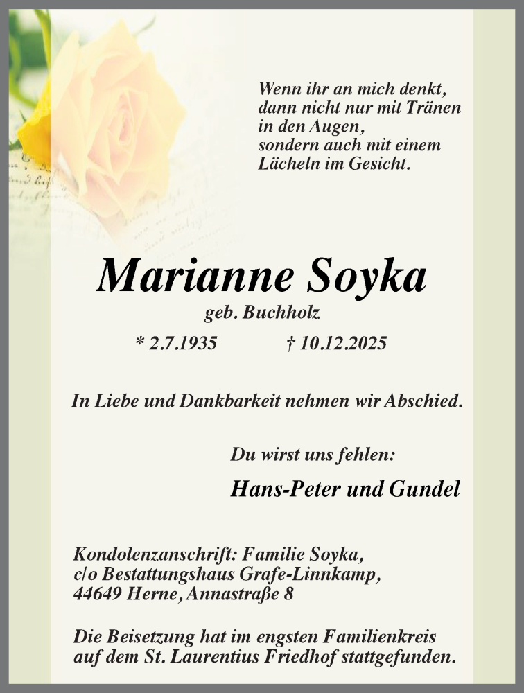 Hier finden Sie alle Traueranzeigen aus der Zeitung, die bisher für Marianne Soyka erschienen sind. Weitere Traueranzeigen, die in der Zeitung erscheinen, werden hier ebenfalls aufgelistet
