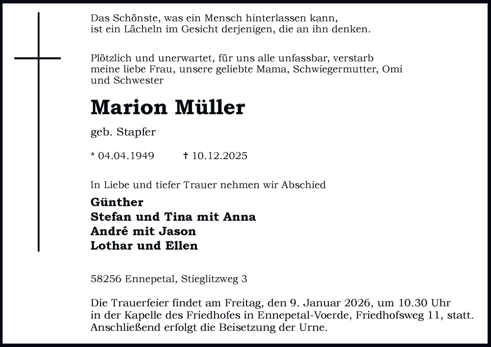 Hier finden Sie alle Traueranzeigen aus der Zeitung, die bisher für Marion Müller erschienen sind. Weitere Traueranzeigen, die in der Zeitung erscheinen, werden hier ebenfalls aufgelistet