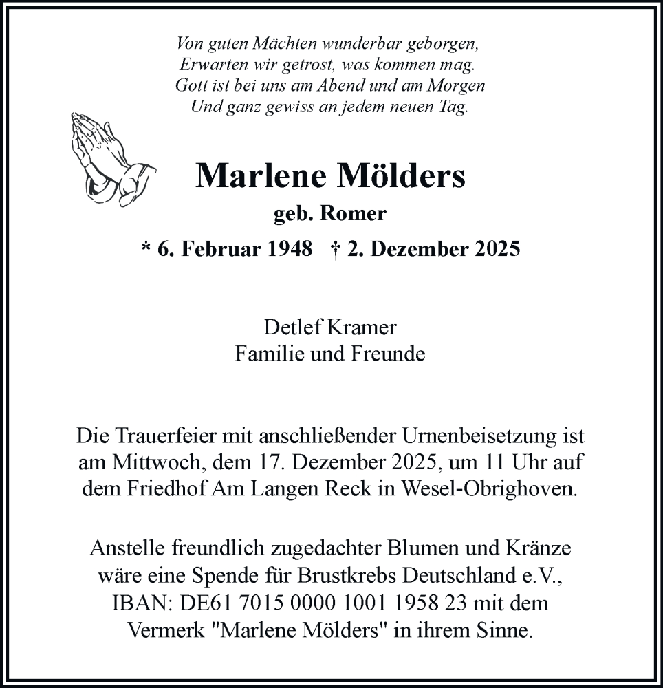 Hier finden Sie alle Traueranzeigen aus der Zeitung, die bisher für Marlene Mölders erschienen sind. Weitere Traueranzeigen, die in der Zeitung erscheinen, werden hier ebenfalls aufgelistet
