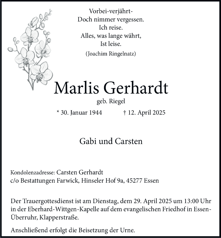 Hier finden Sie alle Traueranzeigen aus der Zeitung, die bisher für Marlis Gerhardt erschienen sind. Weitere Traueranzeigen, die in der Zeitung erscheinen, werden hier ebenfalls aufgelistet