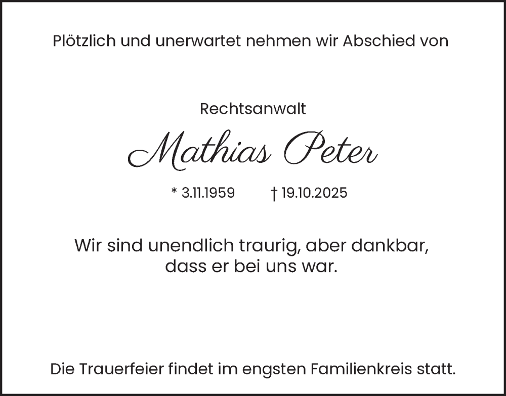 Hier finden Sie alle Traueranzeigen aus der Zeitung, die bisher für Mathias Peter erschienen sind. Weitere Traueranzeigen, die in der Zeitung erscheinen, werden hier ebenfalls aufgelistet