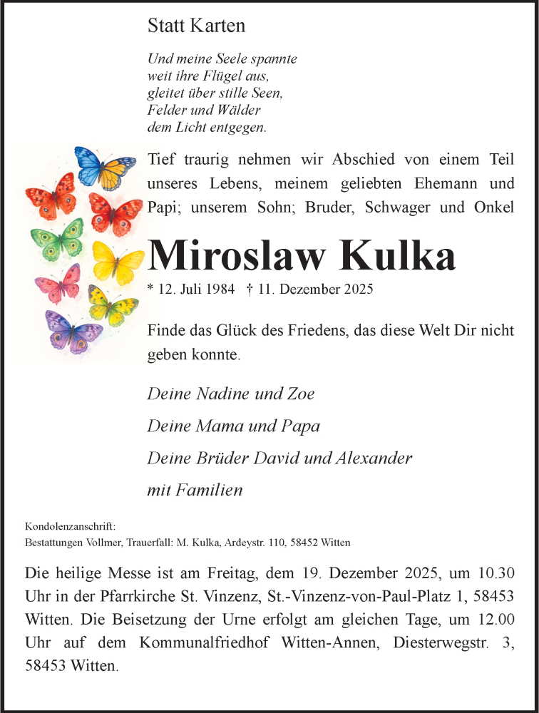 Hier finden Sie alle Traueranzeigen aus der Zeitung, die bisher für Miroslaw Kulka erschienen sind. Weitere Traueranzeigen, die in der Zeitung erscheinen, werden hier ebenfalls aufgelistet