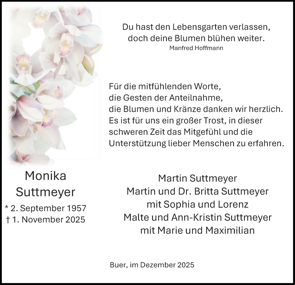 Hier finden Sie alle Traueranzeigen aus der Zeitung, die bisher für Monika Suttmeyer erschienen sind. Weitere Traueranzeigen, die in der Zeitung erscheinen, werden hier ebenfalls aufgelistet