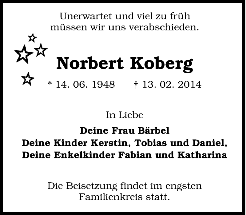 Hier finden Sie alle Traueranzeigen aus der Zeitung, die bisher für Norbert Koberg erschienen sind. Weitere Traueranzeigen, die in der Zeitung erscheinen, werden hier ebenfalls aufgelistet