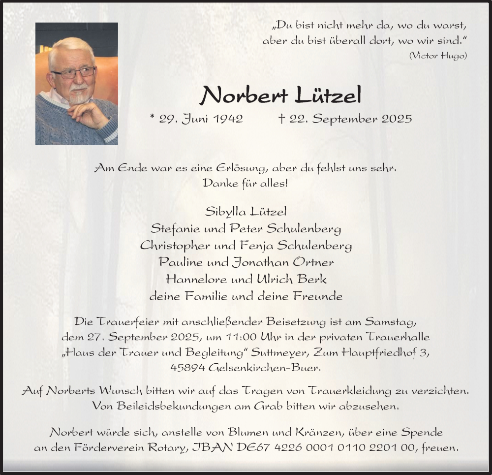 Hier finden Sie alle Traueranzeigen aus der Zeitung, die bisher für Norbert Lützel erschienen sind. Weitere Traueranzeigen, die in der Zeitung erscheinen, werden hier ebenfalls aufgelistet