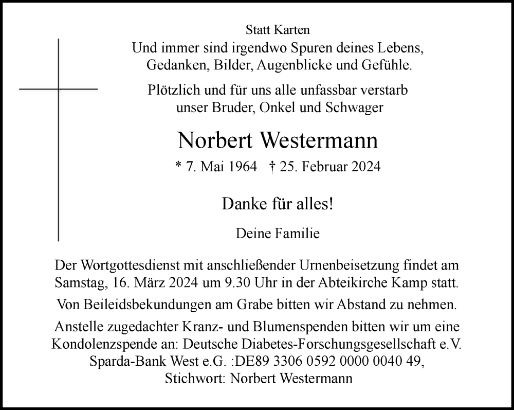 Hier finden Sie alle Traueranzeigen aus der Zeitung, die bisher für Norbert Westermann erschienen sind. Weitere Traueranzeigen, die in der Zeitung erscheinen, werden hier ebenfalls aufgelistet