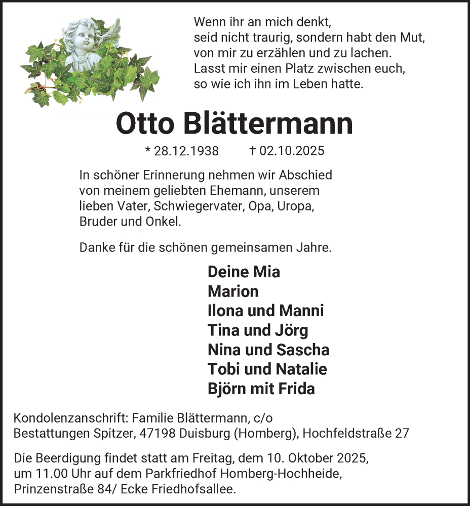 Hier finden Sie alle Traueranzeigen aus der Zeitung, die bisher für Otto Blättermann erschienen sind. Weitere Traueranzeigen, die in der Zeitung erscheinen, werden hier ebenfalls aufgelistet