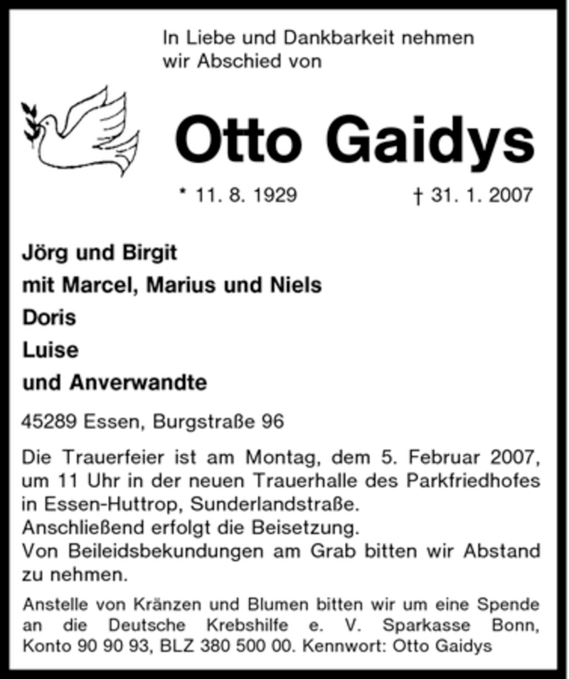 Hier finden Sie alle Traueranzeigen aus der Zeitung, die bisher für Otto Gaidys erschienen sind. Weitere Traueranzeigen, die in der Zeitung erscheinen, werden hier ebenfalls aufgelistet