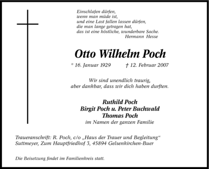 Hier finden Sie alle Traueranzeigen aus der Zeitung, die bisher für Otto Wilhelm Poch erschienen sind. Weitere Traueranzeigen, die in der Zeitung erscheinen, werden hier ebenfalls aufgelistet