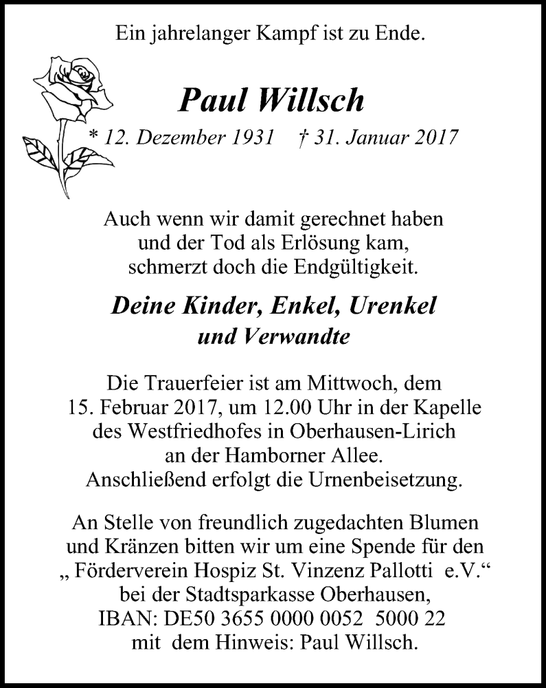 Hier finden Sie alle Traueranzeigen aus der Zeitung, die bisher für Paul Willsch erschienen sind. Weitere Traueranzeigen, die in der Zeitung erscheinen, werden hier ebenfalls aufgelistet