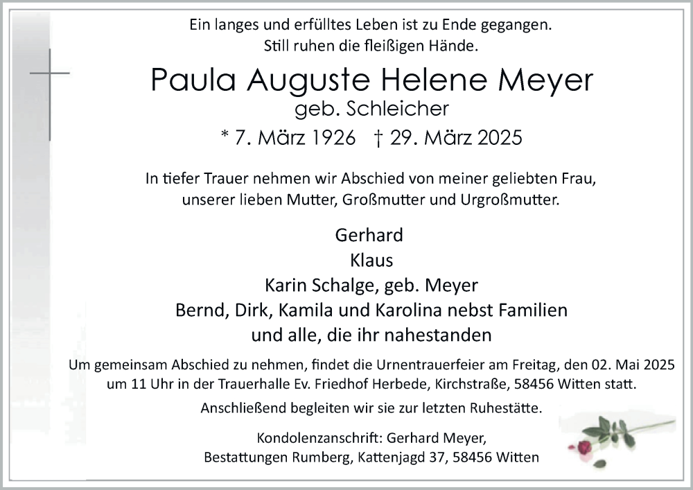 Hier finden Sie alle Traueranzeigen aus der Zeitung, die bisher für Paula Meyer erschienen sind. Weitere Traueranzeigen, die in der Zeitung erscheinen, werden hier ebenfalls aufgelistet