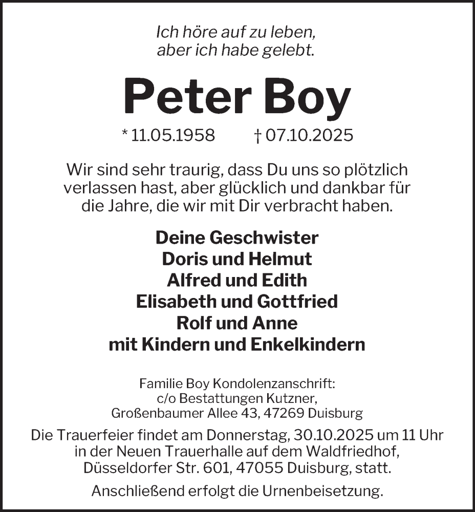 Hier finden Sie alle Traueranzeigen aus der Zeitung, die bisher für Peter Boy erschienen sind. Weitere Traueranzeigen, die in der Zeitung erscheinen, werden hier ebenfalls aufgelistet