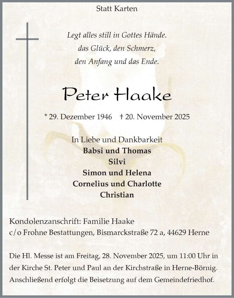 Hier finden Sie alle Traueranzeigen aus der Zeitung, die bisher für Peter Haake erschienen sind. Weitere Traueranzeigen, die in der Zeitung erscheinen, werden hier ebenfalls aufgelistet