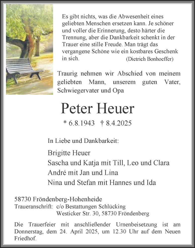 Hier finden Sie alle Traueranzeigen aus der Zeitung, die bisher für Peter Heuer erschienen sind. Weitere Traueranzeigen, die in der Zeitung erscheinen, werden hier ebenfalls aufgelistet
