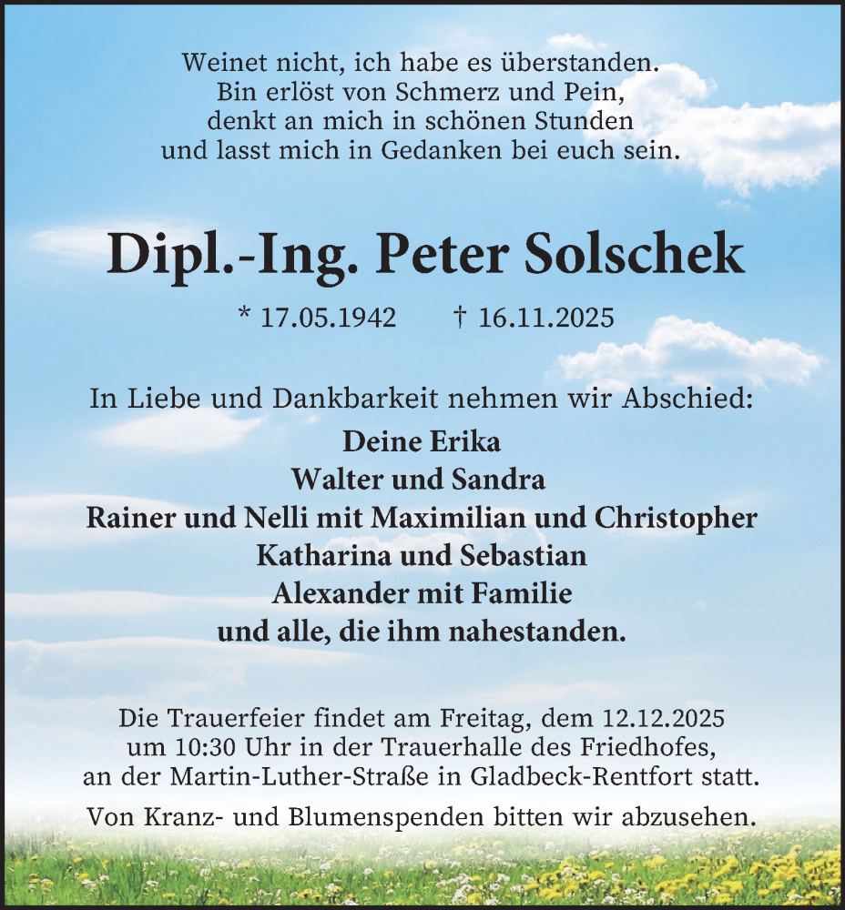 Hier finden Sie alle Traueranzeigen aus der Zeitung, die bisher für Peter Solschek erschienen sind. Weitere Traueranzeigen, die in der Zeitung erscheinen, werden hier ebenfalls aufgelistet