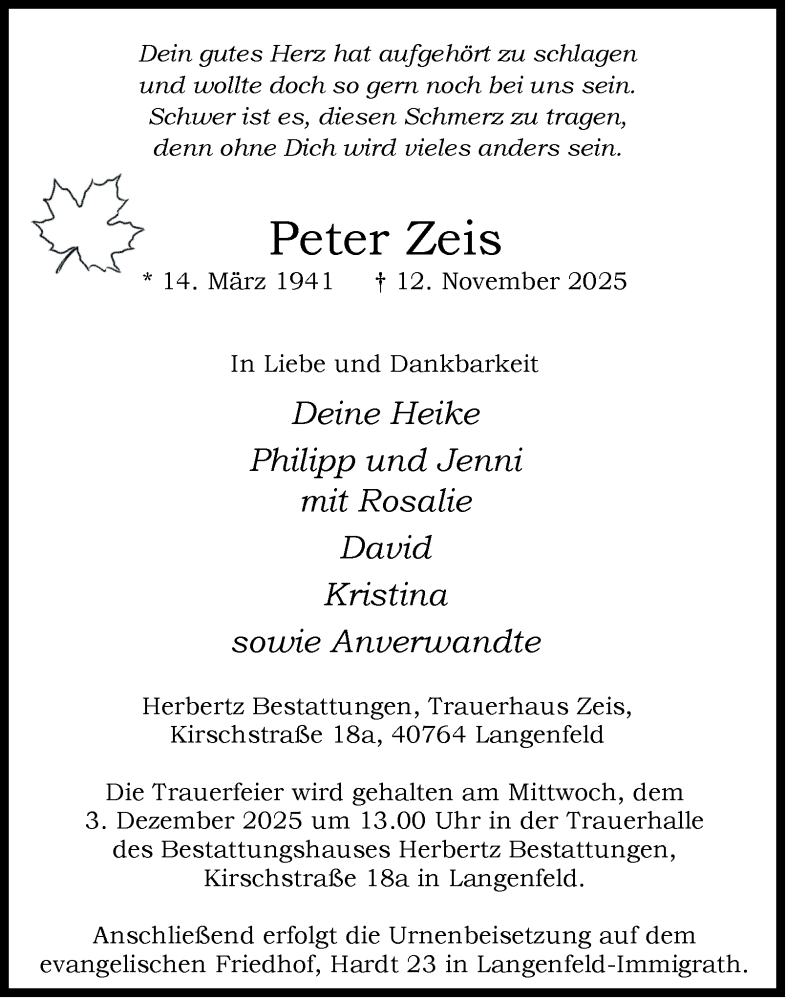 Hier finden Sie alle Traueranzeigen aus der Zeitung, die bisher für Peter Zeis erschienen sind. Weitere Traueranzeigen, die in der Zeitung erscheinen, werden hier ebenfalls aufgelistet