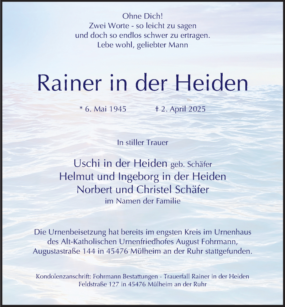 Hier finden Sie alle Traueranzeigen aus der Zeitung, die bisher für Rainer in der Heiden erschienen sind. Weitere Traueranzeigen, die in der Zeitung erscheinen, werden hier ebenfalls aufgelistet