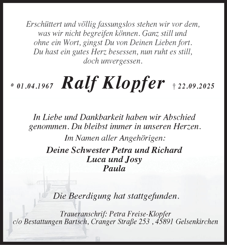 Hier finden Sie alle Traueranzeigen aus der Zeitung, die bisher für Ralf Klopfer erschienen sind. Weitere Traueranzeigen, die in der Zeitung erscheinen, werden hier ebenfalls aufgelistet