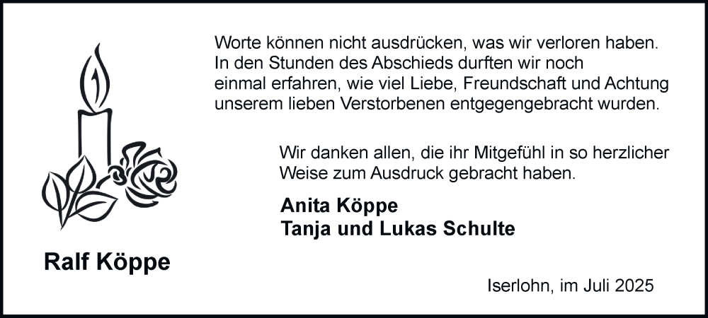 Hier finden Sie alle Traueranzeigen aus der Zeitung, die bisher für Ralf Köppe erschienen sind. Weitere Traueranzeigen, die in der Zeitung erscheinen, werden hier ebenfalls aufgelistet
