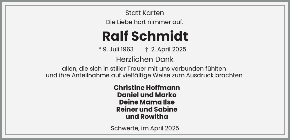 Hier finden Sie alle Traueranzeigen aus der Zeitung, die bisher für Ralf Schmidt erschienen sind. Weitere Traueranzeigen, die in der Zeitung erscheinen, werden hier ebenfalls aufgelistet
