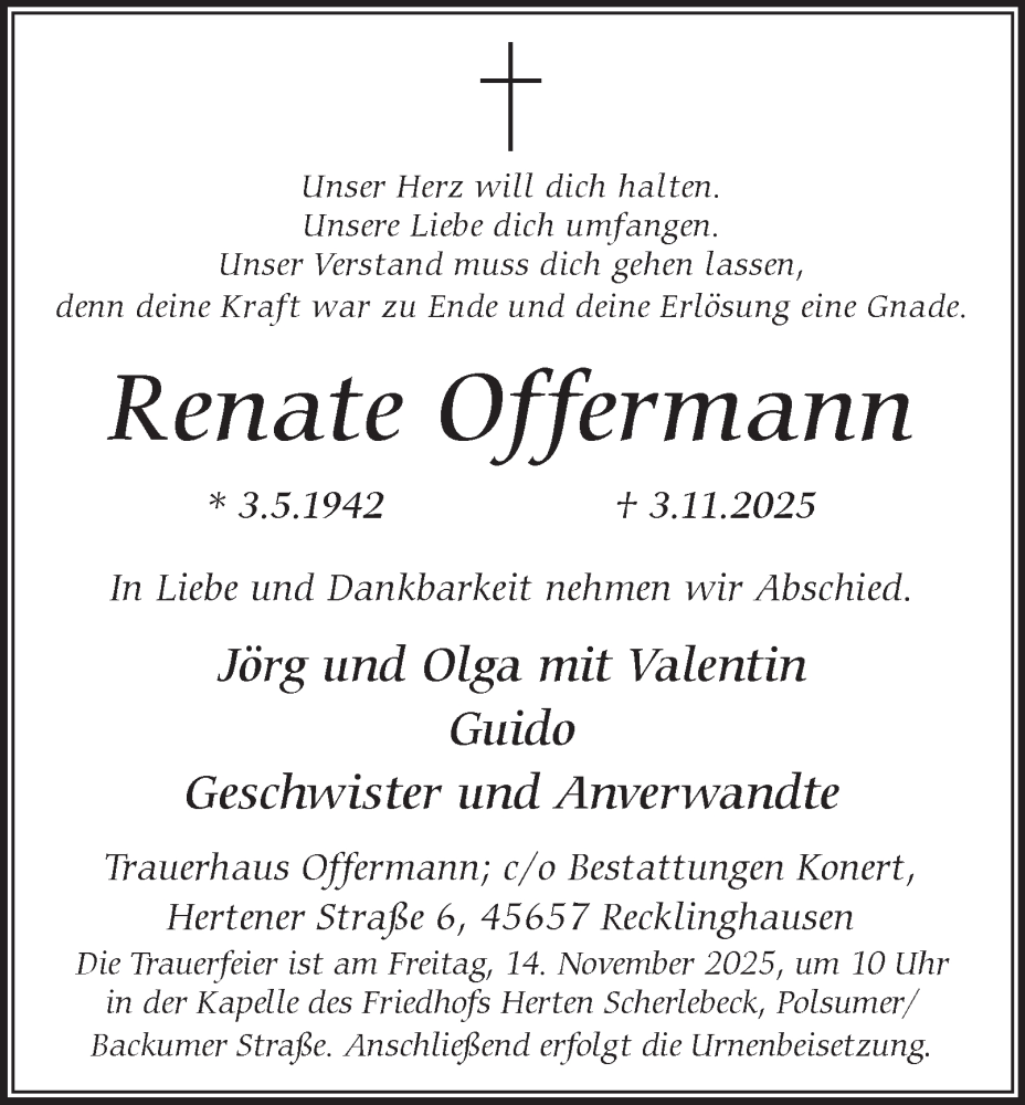 Hier finden Sie alle Traueranzeigen aus der Zeitung, die bisher für Renate Offermann erschienen sind. Weitere Traueranzeigen, die in der Zeitung erscheinen, werden hier ebenfalls aufgelistet