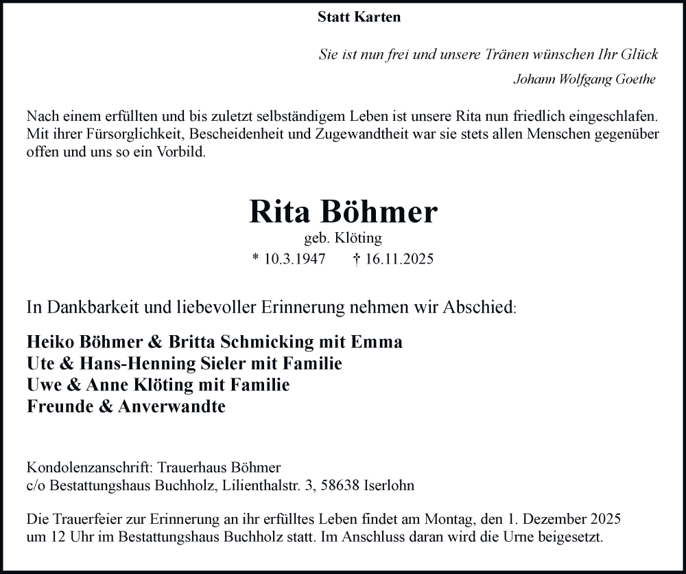 Hier finden Sie alle Traueranzeigen aus der Zeitung, die bisher für Rita Böhmer erschienen sind. Weitere Traueranzeigen, die in der Zeitung erscheinen, werden hier ebenfalls aufgelistet