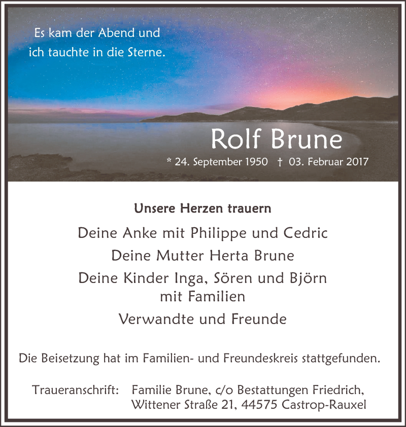 Hier finden Sie alle Traueranzeigen aus der Zeitung, die bisher für Rolf Brune erschienen sind. Weitere Traueranzeigen, die in der Zeitung erscheinen, werden hier ebenfalls aufgelistet