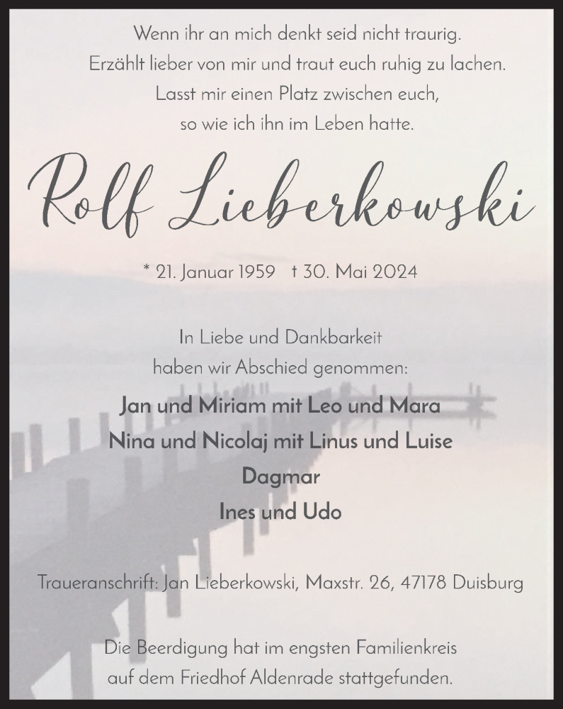 Hier finden Sie alle Traueranzeigen aus der Zeitung, die bisher für Rolf Lieberkowski erschienen sind. Weitere Traueranzeigen, die in der Zeitung erscheinen, werden hier ebenfalls aufgelistet