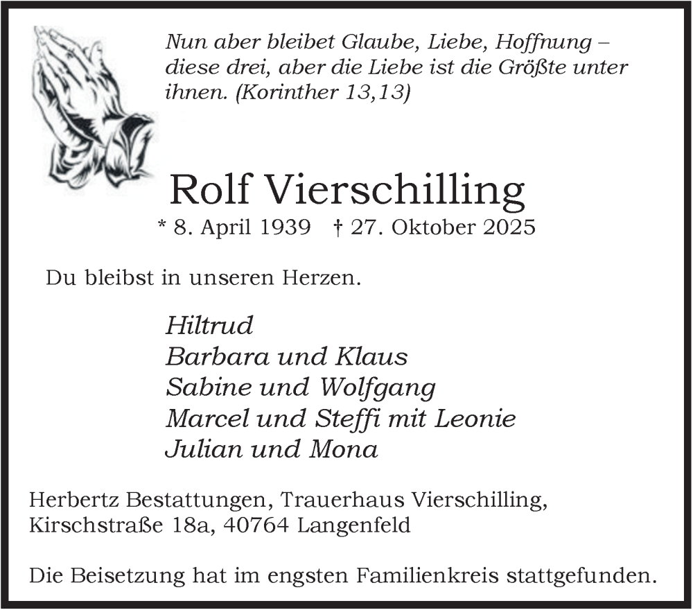 Hier finden Sie alle Traueranzeigen aus der Zeitung, die bisher für Rolf Vierschilling erschienen sind. Weitere Traueranzeigen, die in der Zeitung erscheinen, werden hier ebenfalls aufgelistet