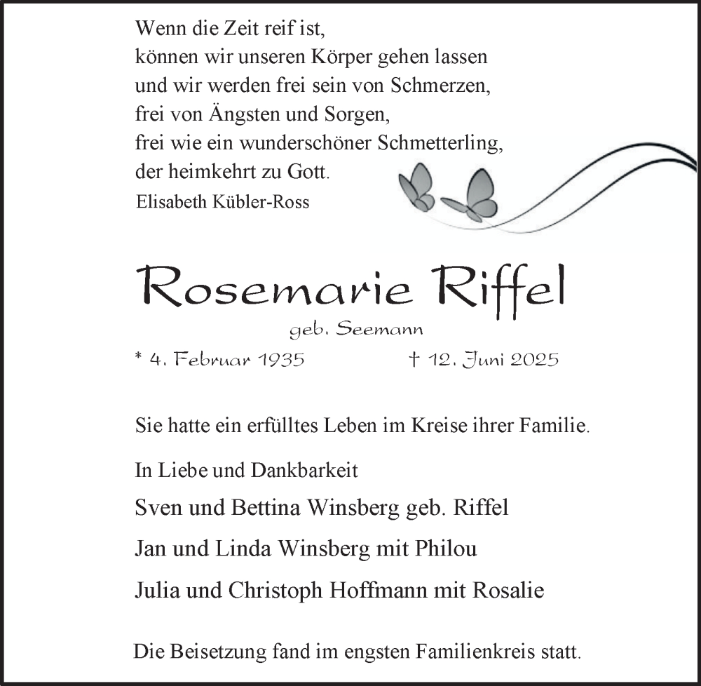 Hier finden Sie alle Traueranzeigen aus der Zeitung, die bisher für Rosemarie Riffel erschienen sind. Weitere Traueranzeigen, die in der Zeitung erscheinen, werden hier ebenfalls aufgelistet