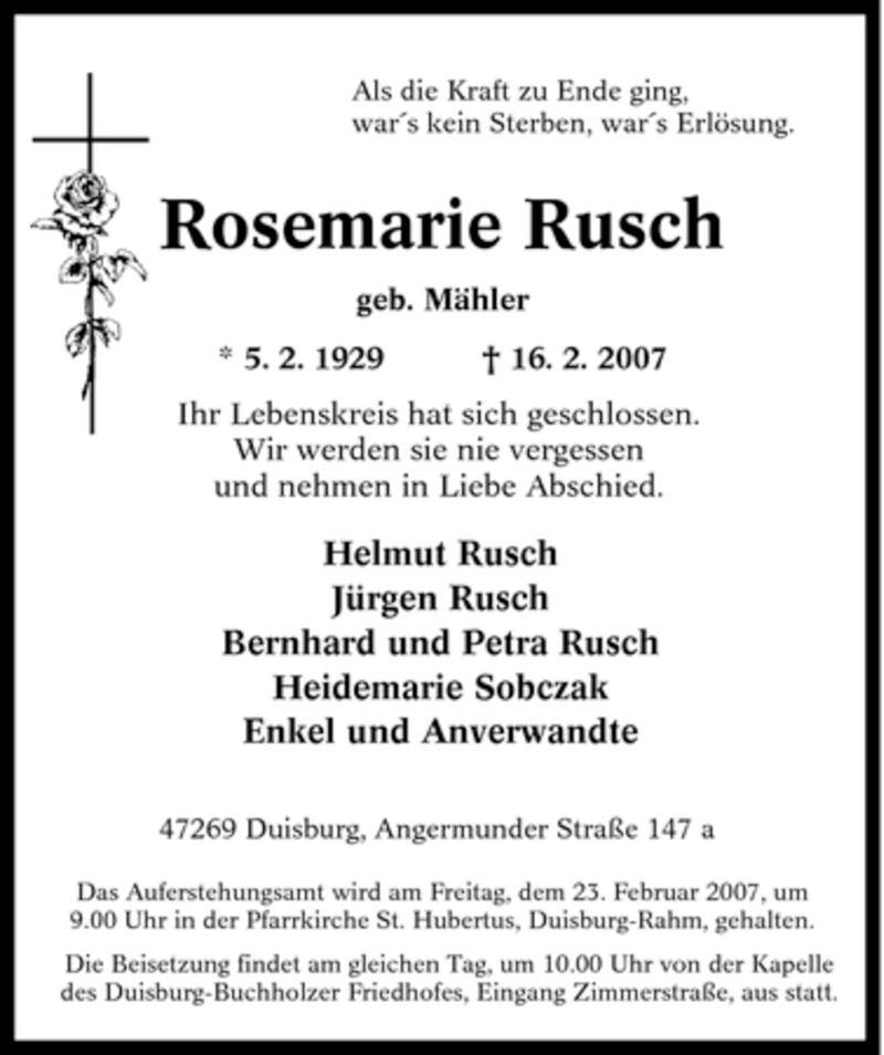 Hier finden Sie alle Traueranzeigen aus der Zeitung, die bisher für Rosemarie Rusch erschienen sind. Weitere Traueranzeigen, die in der Zeitung erscheinen, werden hier ebenfalls aufgelistet