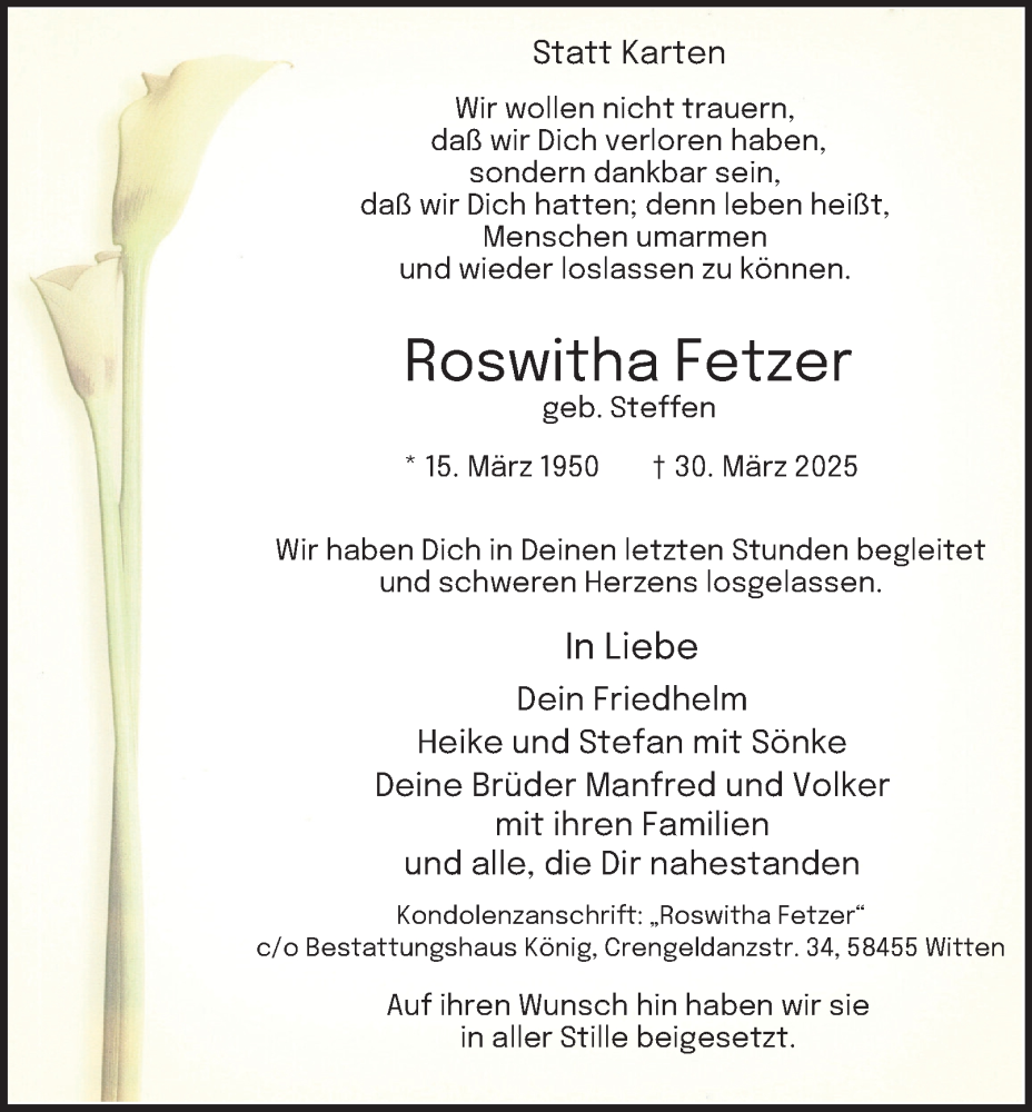 Hier finden Sie alle Traueranzeigen aus der Zeitung, die bisher für Roswitha Fetzer erschienen sind. Weitere Traueranzeigen, die in der Zeitung erscheinen, werden hier ebenfalls aufgelistet