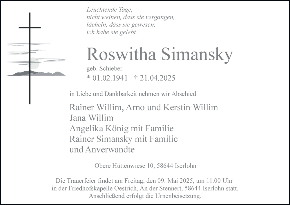 Hier finden Sie alle Traueranzeigen aus der Zeitung, die bisher für Roswitha Simansky erschienen sind. Weitere Traueranzeigen, die in der Zeitung erscheinen, werden hier ebenfalls aufgelistet