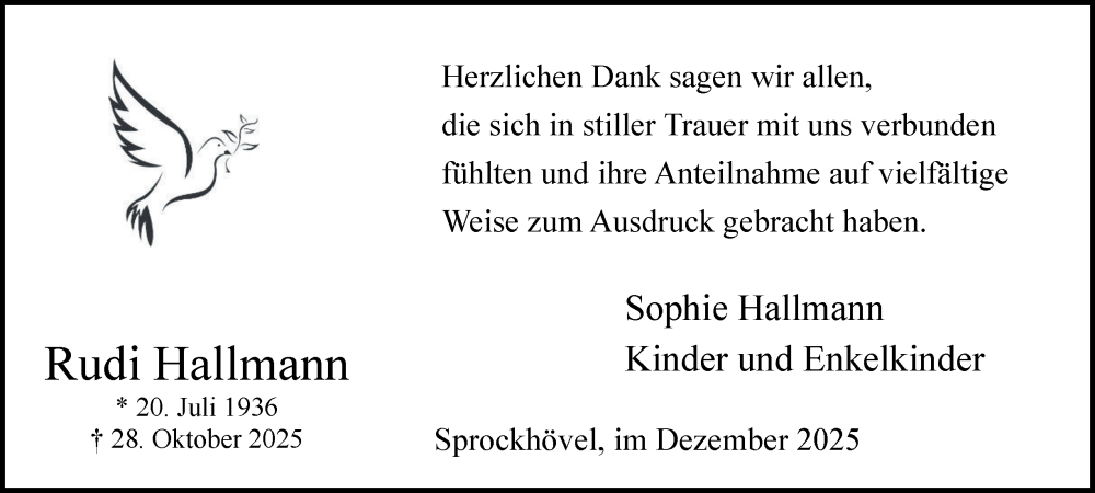 Hier finden Sie alle Traueranzeigen aus der Zeitung, die bisher für Rudi Hallmann erschienen sind. Weitere Traueranzeigen, die in der Zeitung erscheinen, werden hier ebenfalls aufgelistet