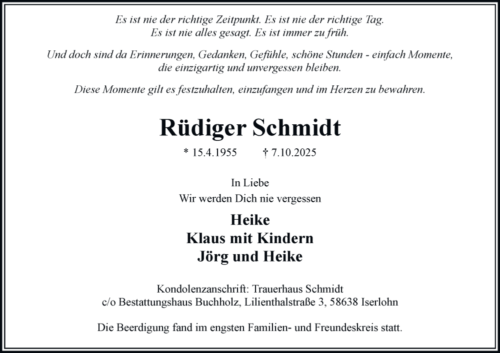 Hier finden Sie alle Traueranzeigen aus der Zeitung, die bisher für Rüdiger Schmidt erschienen sind. Weitere Traueranzeigen, die in der Zeitung erscheinen, werden hier ebenfalls aufgelistet