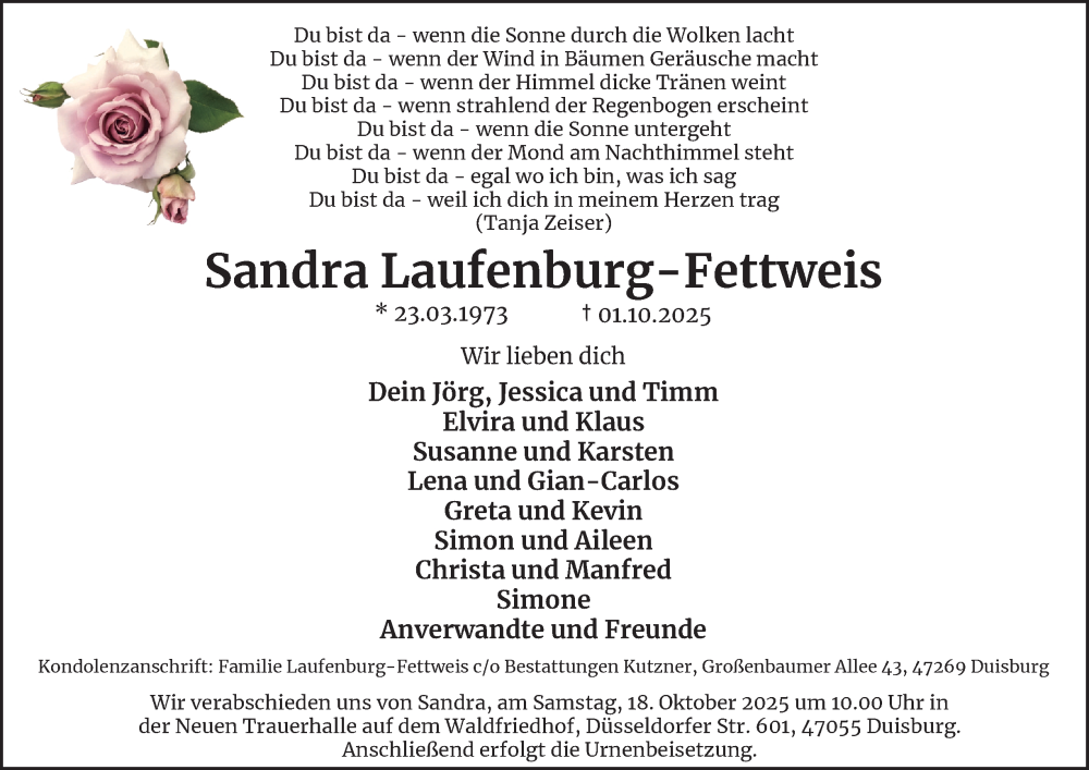 Hier finden Sie alle Traueranzeigen aus der Zeitung, die bisher für Sandra Laufenburg-Fettweis erschienen sind. Weitere Traueranzeigen, die in der Zeitung erscheinen, werden hier ebenfalls aufgelistet