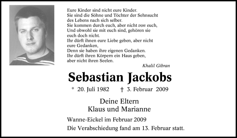 Hier finden Sie alle Traueranzeigen aus der Zeitung, die bisher für Sebastian Jackobs erschienen sind. Weitere Traueranzeigen, die in der Zeitung erscheinen, werden hier ebenfalls aufgelistet