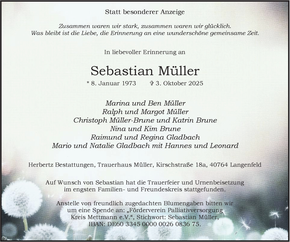 Hier finden Sie alle Traueranzeigen aus der Zeitung, die bisher für Sebastian Müller erschienen sind. Weitere Traueranzeigen, die in der Zeitung erscheinen, werden hier ebenfalls aufgelistet