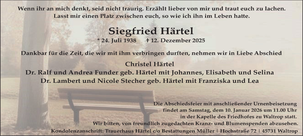 Hier finden Sie alle Traueranzeigen aus der Zeitung, die bisher für Siegfried Härtel erschienen sind. Weitere Traueranzeigen, die in der Zeitung erscheinen, werden hier ebenfalls aufgelistet