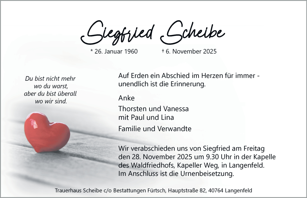 Hier finden Sie alle Traueranzeigen aus der Zeitung, die bisher für Siegfried Scheibe erschienen sind. Weitere Traueranzeigen, die in der Zeitung erscheinen, werden hier ebenfalls aufgelistet