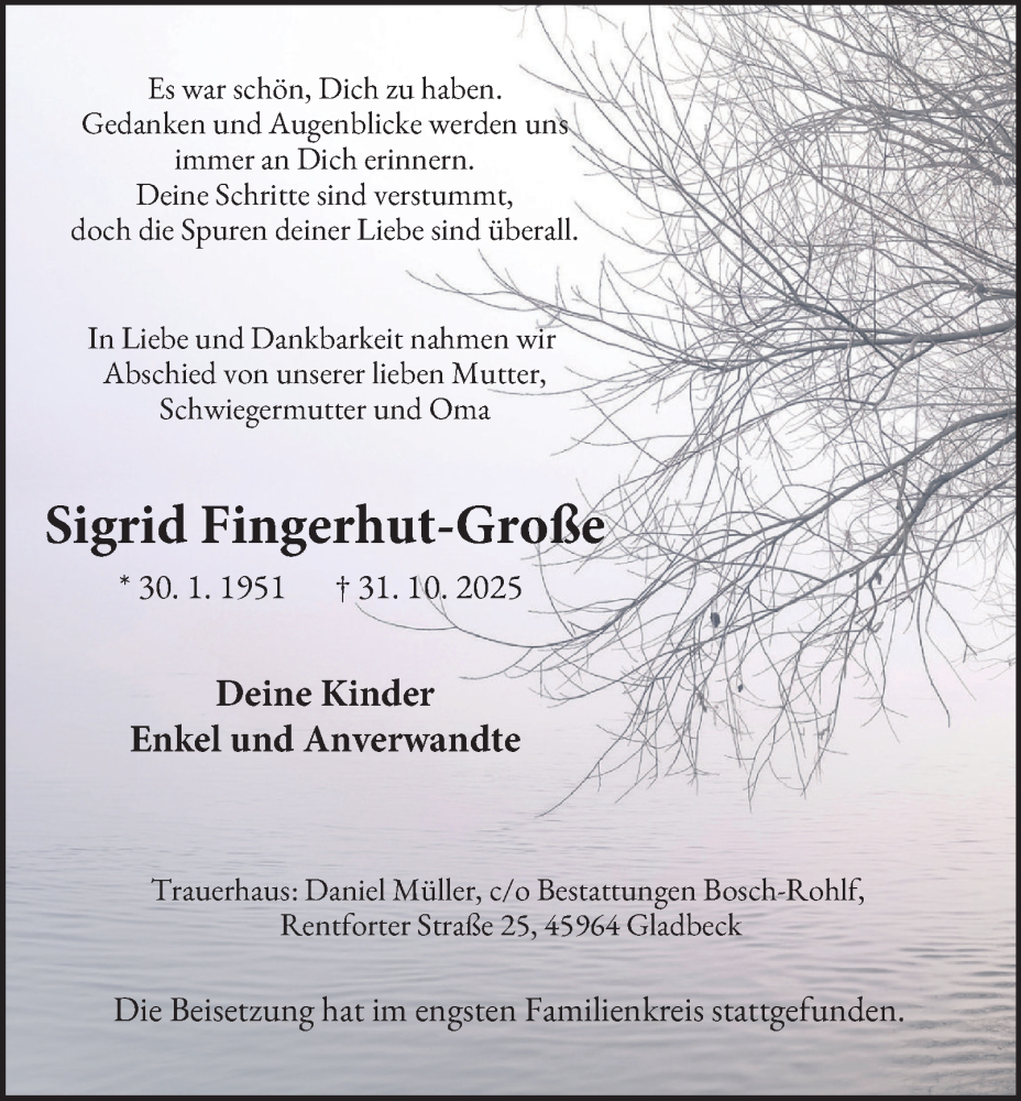 Hier finden Sie alle Traueranzeigen aus der Zeitung, die bisher für Sigrid Fingerhut-Große erschienen sind. Weitere Traueranzeigen, die in der Zeitung erscheinen, werden hier ebenfalls aufgelistet