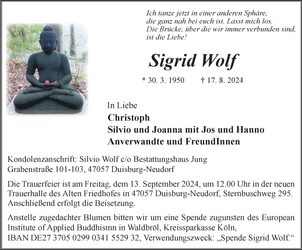 Hier finden Sie alle Traueranzeigen aus der Zeitung, die bisher für Sigrid Wolf erschienen sind. Weitere Traueranzeigen, die in der Zeitung erscheinen, werden hier ebenfalls aufgelistet
