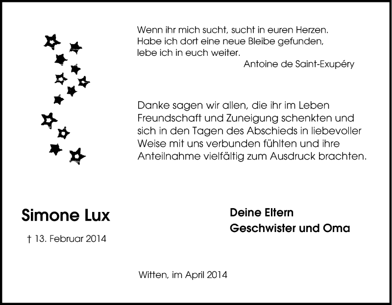 Hier finden Sie alle Traueranzeigen aus der Zeitung, die bisher für Simone Lux erschienen sind. Weitere Traueranzeigen, die in der Zeitung erscheinen, werden hier ebenfalls aufgelistet