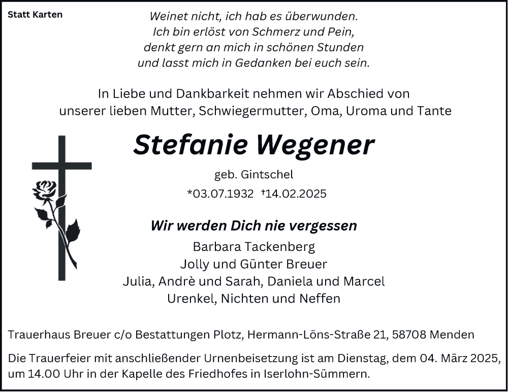 Hier finden Sie alle Traueranzeigen aus der Zeitung, die bisher für Stefanie Wegener erschienen sind. Weitere Traueranzeigen, die in der Zeitung erscheinen, werden hier ebenfalls aufgelistet