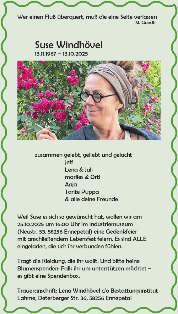 Hier finden Sie alle Traueranzeigen aus der Zeitung, die bisher für Suse Windhövel erschienen sind. Weitere Traueranzeigen, die in der Zeitung erscheinen, werden hier ebenfalls aufgelistet