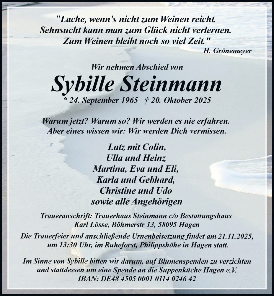 Hier finden Sie alle Traueranzeigen aus der Zeitung, die bisher für Sybille Steinmann erschienen sind. Weitere Traueranzeigen, die in der Zeitung erscheinen, werden hier ebenfalls aufgelistet