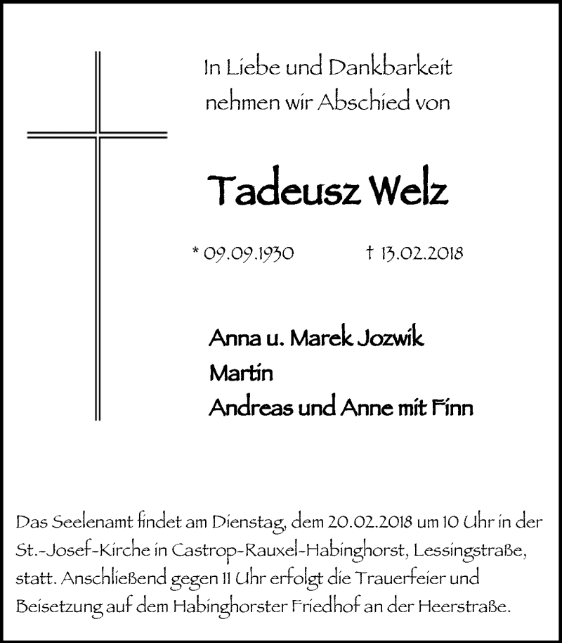 Hier finden Sie alle Traueranzeigen aus der Zeitung, die bisher für Tadeusz Welz erschienen sind. Weitere Traueranzeigen, die in der Zeitung erscheinen, werden hier ebenfalls aufgelistet