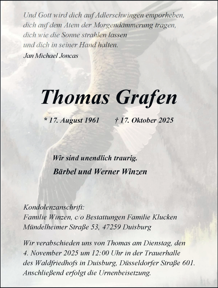 Hier finden Sie alle Traueranzeigen aus der Zeitung, die bisher für Thomas Grafen erschienen sind. Weitere Traueranzeigen, die in der Zeitung erscheinen, werden hier ebenfalls aufgelistet