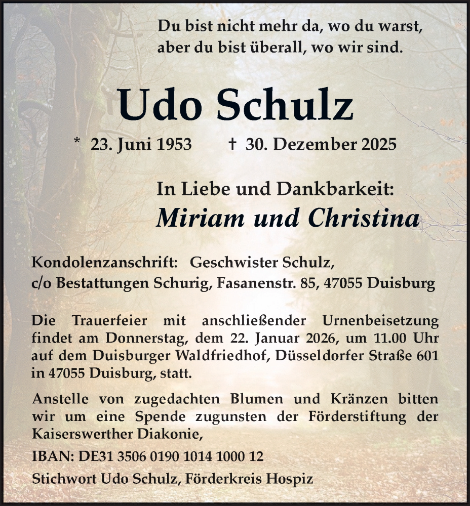 Hier finden Sie alle Traueranzeigen aus der Zeitung, die bisher für Udo Schulz erschienen sind. Weitere Traueranzeigen, die in der Zeitung erscheinen, werden hier ebenfalls aufgelistet