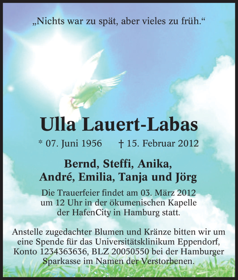 Hier finden Sie alle Traueranzeigen aus der Zeitung, die bisher für Ulla Lauert-Labas erschienen sind. Weitere Traueranzeigen, die in der Zeitung erscheinen, werden hier ebenfalls aufgelistet
